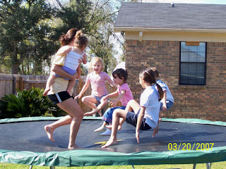 Caddy-cornered to our backyard are our good friends Rhonda and Will. They have two gorgeous girls, Jocelyn and Jaydin. We love to go over to their house b/c they have a huge trampoline which is a huge hit with the kids. Here are the kids jumping. Even Kyla got hooked to it! Thanks to Rhonda for taking the pics for me.
